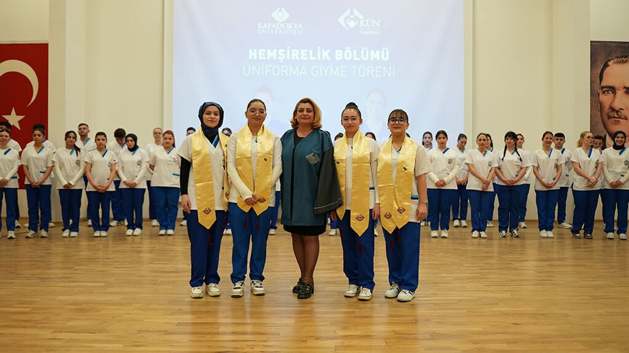 Kapadokya Üniversitesi (KÜN) Sağlık Bilimleri Yüksekokulu Ebelik ve Hemşirelik Bölümü 1. sınıf öğrencileri için üniforma giyme töreni düzenlendi. Törenle birlikte öğrenciler meslek hayatlarına ilk adımı attı.