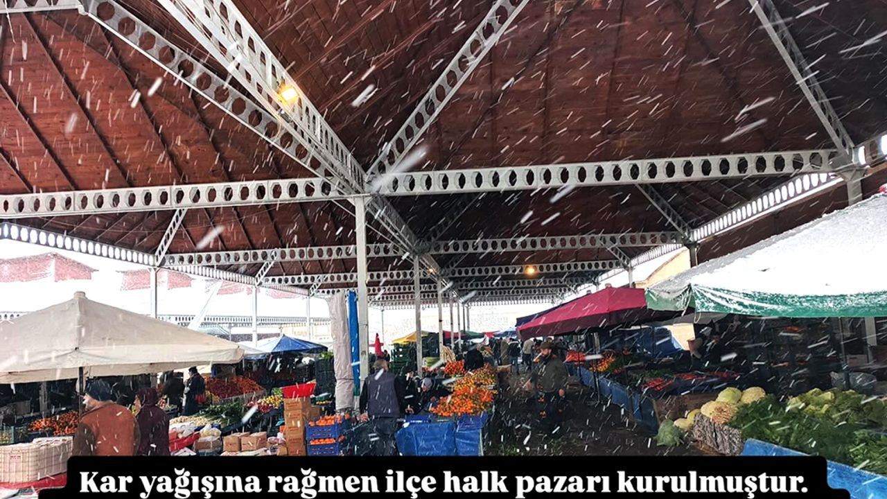 Olumsuz hava koşullarına rağmen pazarın açık olduğu yönünde vatandaşlara bilgilendirme yapılırken, kapalı pazar alanında kurulan tezgâhlarda sebze, meyve ve çeşitli gıda ürünleri satışa sunuldu. Kar yağışı altında pazarcı esnafı, vatandaşlara hizmet vermeyi sürdürdü.
