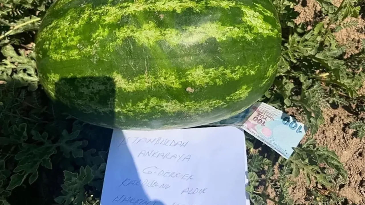 İstanbul’dan Ankara’ya seyahat eden bir kişi, yol kenarındaki karpuz tarlasından izinsiz karpuz aldı. Ancak vicdanen rahatsız olan bu kişi, karpuzun altına 100 TL ve “İstanbul’dan Ankara’ya giderken karpuzunu aldık. Hakkını helal et” yazılı bir not bırakarak tarladan ayrıldı.