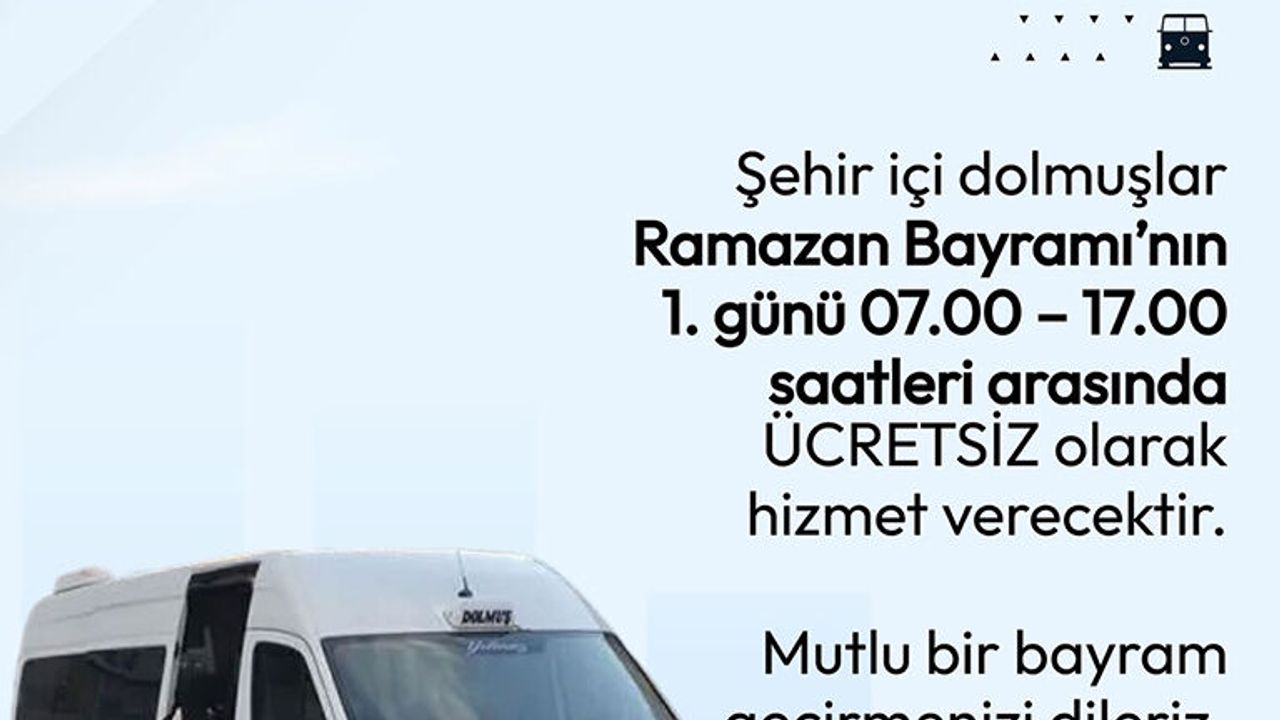 Buna göre, Ali Ertuğrul Bulvarı hattında hizmet veren şehir içi dolmuşlar, Ramazan Bayramı’nın birinci günü 07.00 – 17.00 saatleri arasında vatandaşlara ücretsiz olarak hizmet verecektir. Bayram ziyaretlerini daha rahat gerçekleştirebilmeleri amacıyla alınan bu karar kapsamında, hemşehrilerimiz gün boyunca ücretsiz ulaşım imkânından yararlanabilecektir.